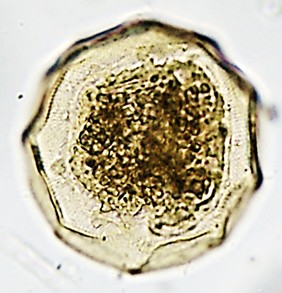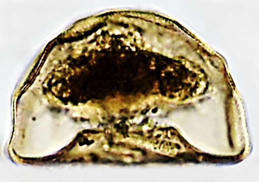 Dimensões e Média (em µm): Diâmetro=52-85 (61); Altura= 29-55 (37); PS=12-26 (15). As medidas (n=13). e a razão D/ALT= 1,5-2,0 (1,8) estiveram próximos do reportado pelo autor, sendo alguns espécimes com medidas inferiores e outros superiores..