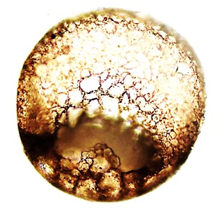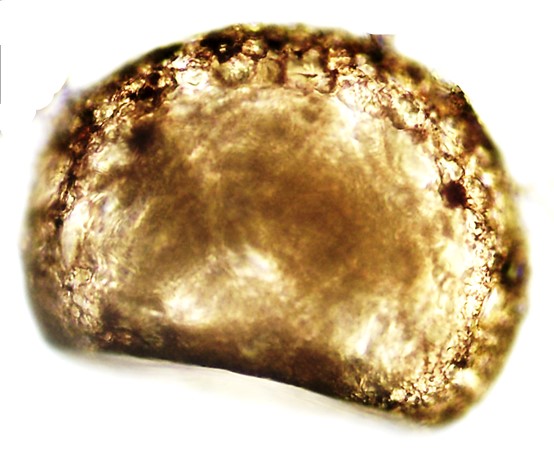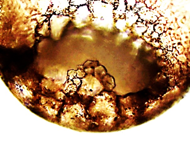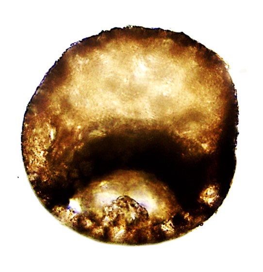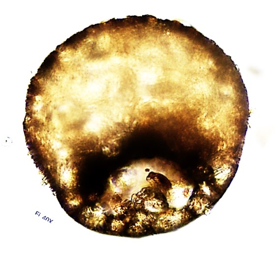 Aspectos da teca: Circular, ligeiramente alargada, em vista oral e hemisférica alta em vista lateral. Revestimento de pequenas partículas bem coladas, superfície lisa. Abertura elíptica, invaginada, relativamente grande, apresentando um pequeno “arco” formado com pequenas pedras centralizado na porção inferior (dorsal), como visto no detalhe da Figura E.