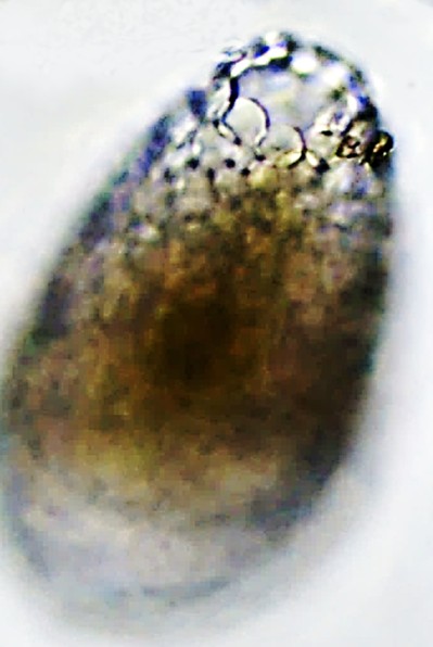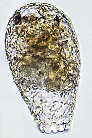 Dimensões e Média (em µm): Comprimento = 93-134,5 (120); Largura= 57-80 (71); PS = 16-24 (21). Algumas das medidas (N=12) estiveram ligeiramente inferiores ou superiores, mas as razões C/L = 1,6-1,8 (1,7) coincidiram com às reportadas pelo autor.