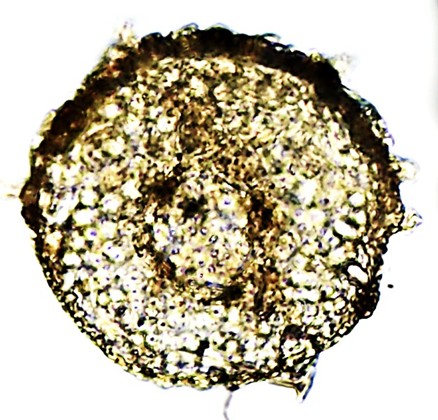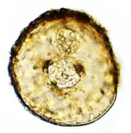 Dimensões e Média (em µm): Comprimento= 66,5-103 x 61,5-94 (89×80); Altura (Espessura)= 33-41 (36); PS=18×20-26×56 (21×29). As medidas (n=12) e as Razões C/A = 2,0-2,8 (2,5) coincidiram com as especificadas pelos autores.