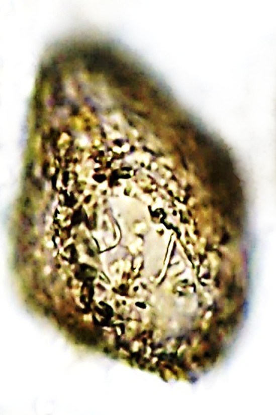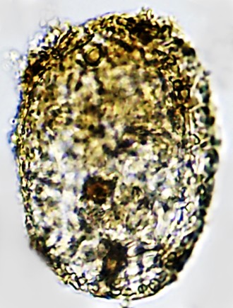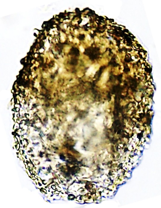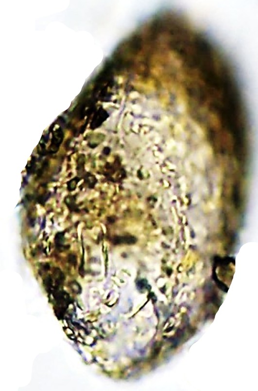 Dimensões e Média (em µm): Comprimento= 80-100 (92); Largura=64-86 (70); Abertura (maior eixo) = 26-44 (34). As medidas (n=10) apresentaram razão C/L = 1,1-1,4(1,3).