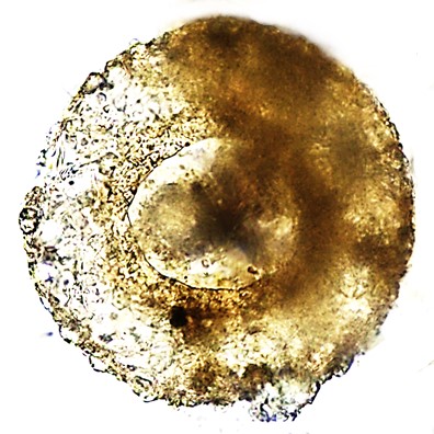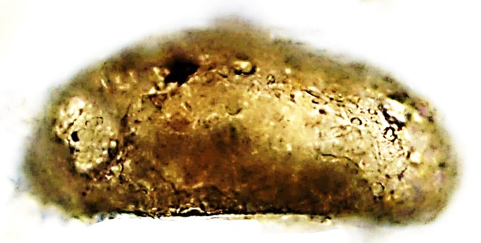 Dimensões (em µm): Diâmetro=169; Altura=72; PS=66. A medida (n=1) do diâmetro ficou ligeiramente inferior à indicada pelo autor (D=187), mas os demais aspectos coincidiram. E as razões encontradas foram: D/A =2,3 e PS/D =0,39.