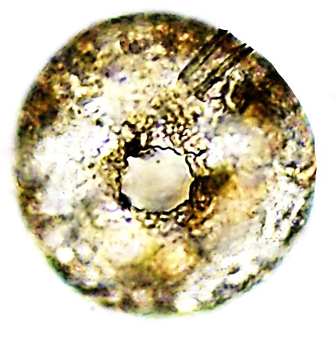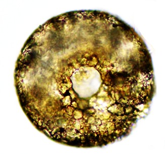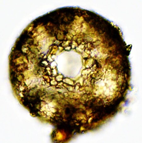 Dimensões e Média (em µm): Diâmetro=85-115 (97); Altura= 60-90 (70); PS= 17-38 (21). As medidas (n=16) e as razões D/A= 1,3-1,4 (1,4) e PS/D = 0,20-0,25 (0,22) não coincidiram com as espécies descritas.