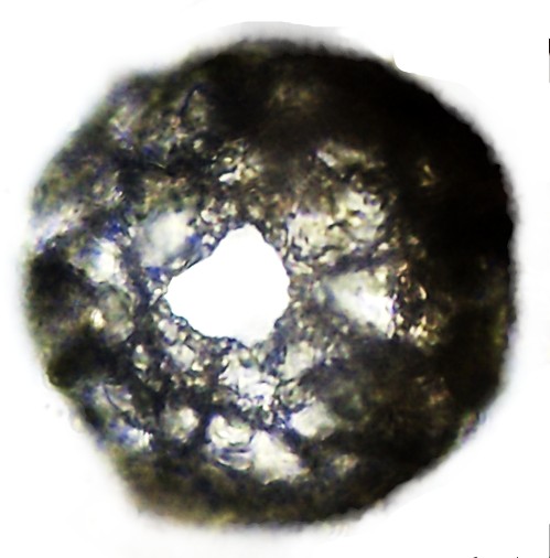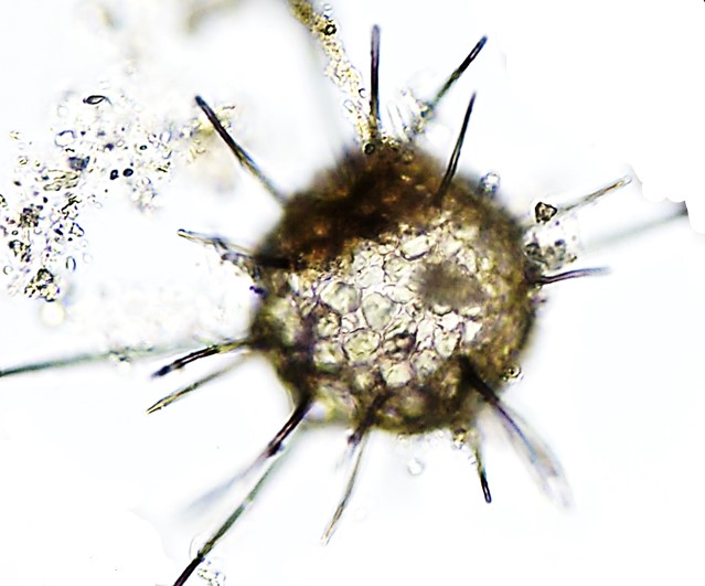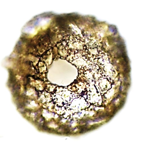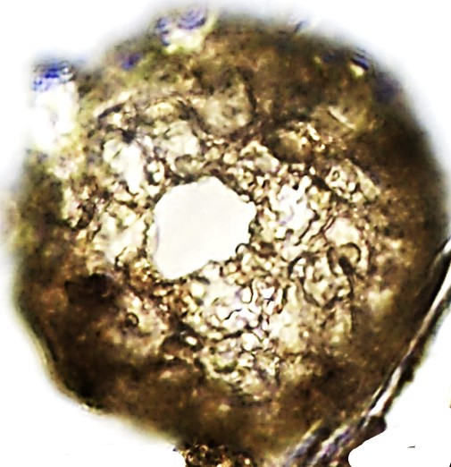 Aspectos da teca: Globular, marrom-escura, pouco transparente. Revestimento de partículas angulares pequenas e médias, algumas salientes, podendo apresentar superfície rugosa. Abertura (PS) circular-irregular e sem lábio. Foi observado um espécime que incorporou à teca “espinhos de origem vegetal (?)” em sua superfície (Figura F).