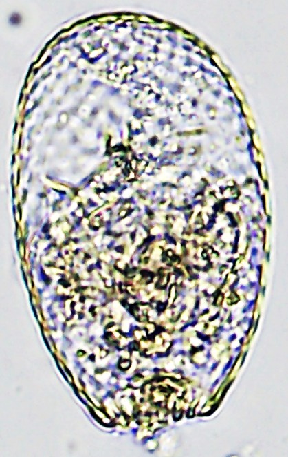 Dimensões e Média (em µm): Comprimento=57-95 (70); Largura=36-68 (43); PS=12-25 (17). Algumas medidas (n=25) ficaram ligeiramente inferiores e superiores as do autor. Relação C/L = 1,5-1,9.