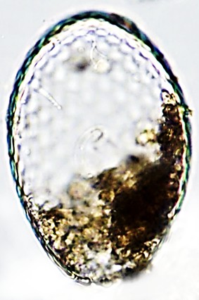 Aspectos da teca: Oviforme-larga, não comprimida, de aspecto liso e regular, “lembrando” a aparência de Euglypha polylepis. Abertura circular com escamas com denticulação descrescente.