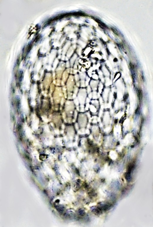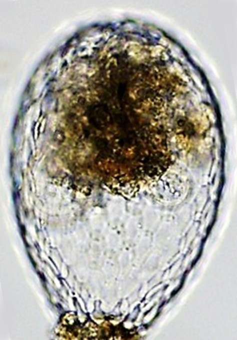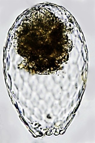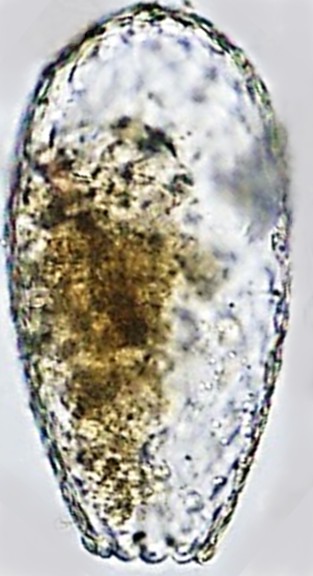 Dimensões e Média (em µm): Comprimento= 100-178 (147); Largura=60-109 (94); PS=19-37 (30). As medidas (n=21) não coincidiram com as espécies descritas. Relação C/L = 1,4-1,7 (1,6).