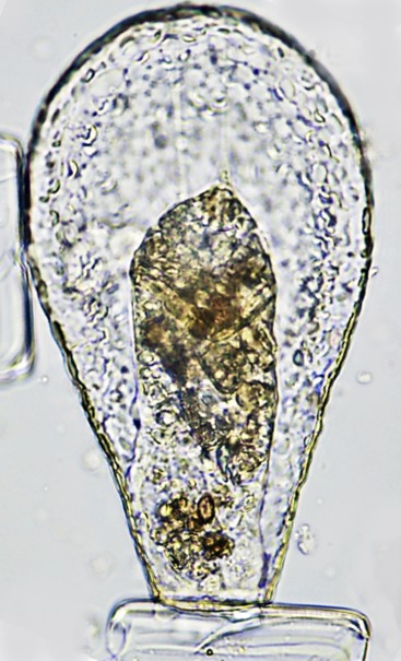 Aspectos da teca: Teca piriforme, grande, comprimida e transparente. Presença de quilha lateral (oca) ao longo da margem da teca. Abertura (PS) oval e reta com um lábio orgânico, relativamente pequena.. Veja o vídeo: https://youtu.be/7OVm6jDqqaw