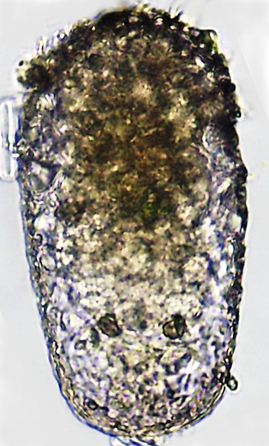 Dimensões e Média (em µm): Comprimento= 57-125 (83); Largura= 30-67 (43); PS= 19-57 (30). Algumas das medidas (n=37) estiveram superiores ou inferiores, mas a razão de C/L = 1,8-2,2 (1,9) coincidiu com as do autor.