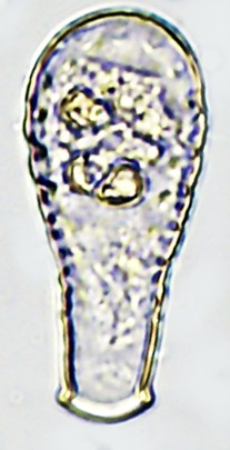 Dimensões (em µm): Comprimento=55-74 (68); Largura=28-34 (31); Prof.-lateral=26; PS=10-15 (13). Algumas das medidas (n=7) estiveram inferiores as do autor. A razão C/L = 1,9-2,4 (2,2).