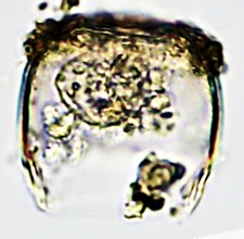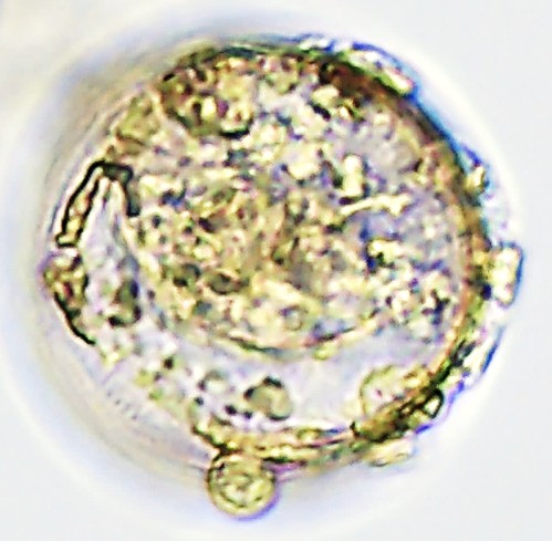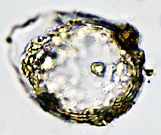 Dimensões e Média (em µm): Diâmetro= 39,5-46 (43); Altura=31,5-52 (39,5). As medidas (n=7) não foram coincidentes com as descritas pelos taxonomistas.