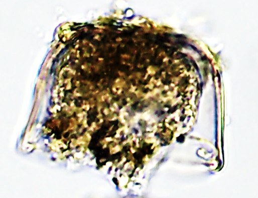 Aspectos da teca: Vista de cima é circular e de pequena dimensão. Quando vista de lado, observa-se uma carapaça, relativamente longa, fina e delicada, transparente, translúcida terminando com uma borda fina.
