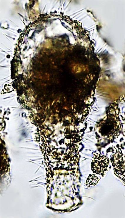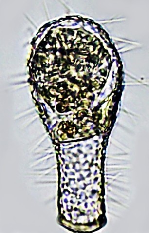 Observação 2: Em vários tipos de ambientes aquáticos do Brasil encontra-se essa espécie que normalmente apresenta espinhos relativamente longos, finos e transparentes, que se “espalham” por toda a teca. Mas os espécimes observados em musgos úmidos, coletados na areia das margens de rios, apresentaram espinhos grosseiros, em menor número, distribuídos somente no corpo da teca (ausente no pescoço), conforme visto nas Fotos abaixo.