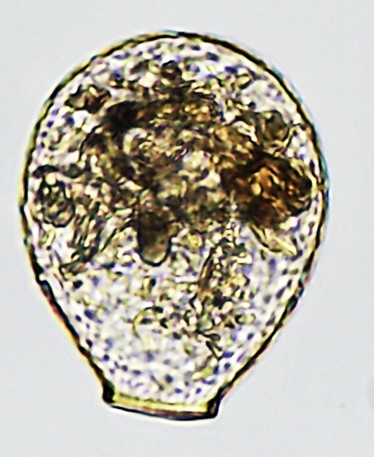 Dimensões (em µm): Comprimento=80-97 (87); Largura=55-73 (64); PS=18-24(22). As medidas (n=22) e as razões de C/L = 1,2-1,5 (1,4) e L/PS=2,5-3,0 (2,9) coincidiram às citadas pelos autores, mas coincidiram.