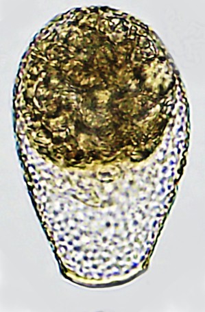 Aspectos da teca: Oviforme, comprimida e transparente. Abertura (PS) larga, arqueada, com fino lábio. Placas circulares ou poligonais recobrem a teca.