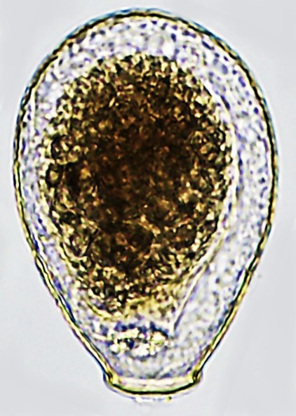 Dimensões e Média (em µm): Comprimento= 94,5-105 (99); Largura= 67-77 (72); PS= 19,5-22,5 (21). As medidas (n=11) e as razões de C/L = 1,3-1,5 (1,4), L/PS = 3,0-3,8 (3,4) e de PS/C = 0,20-0,23 (0,21) não coincidiram com as reportadas pelas espécies já publicadas.