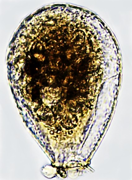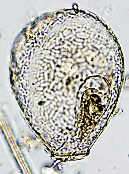 Aspectos da teca: Oviforme-larga, comprimida e transparente. Abertura (PS), relativamente pequena, levemente arqueada e com fino lábio. Placas circulares ou poligonais recobrem a teca.