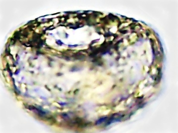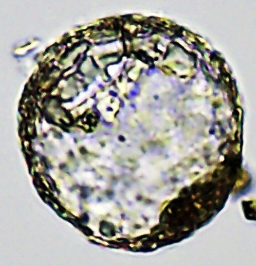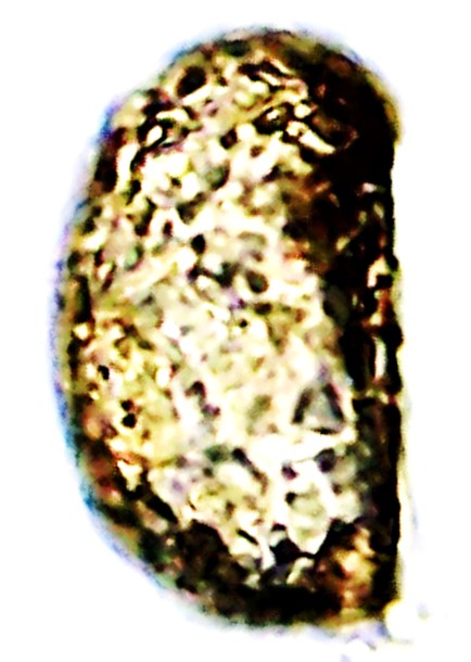 Dimensões e Média (em µm): Diâmetro= 42-55 (50); Altura= 20-29 (25). Algumas das medidas (n=14) ficaram ligeiramente superiores às do autor.