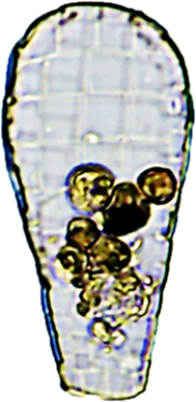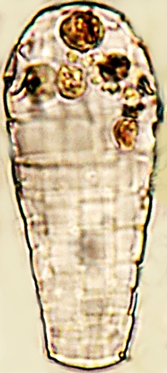 Dimensões (em µ) e Média: Comprimento=66-90 (80); Largura=30-46 (37); PS=11-21(17); Placas=2-12. Algumas das medidas (n=34) foram ligeiramente inferiores ou superiores às do autor (C=83-91; L=37-45; PS=21-23), notadamente para a Abertura (PS), mas as razões C/L=2,1-2,5 (2,2) foram coincidentes.