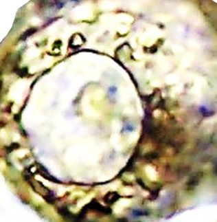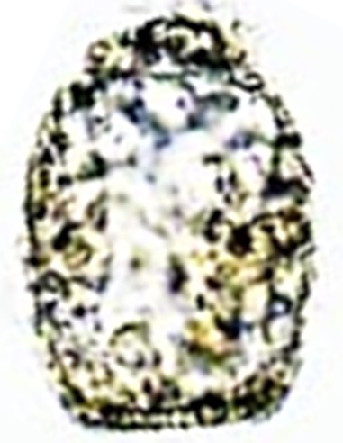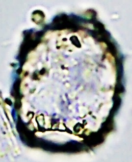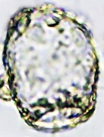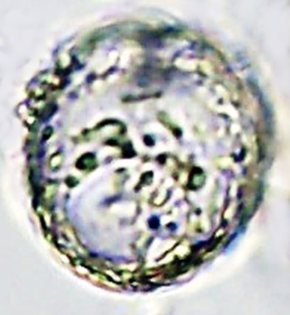Dimensões (em µm): Comprimento=33,5-45 (40); Largura=27-33 (31); PS= 13-18 (15). As medidas (17) e as razões : C/L = 1,3-1,5 (1,4) e de L/PS = 1,8-2,3 (2,0) coincidiram com as reportadas pelos autores.