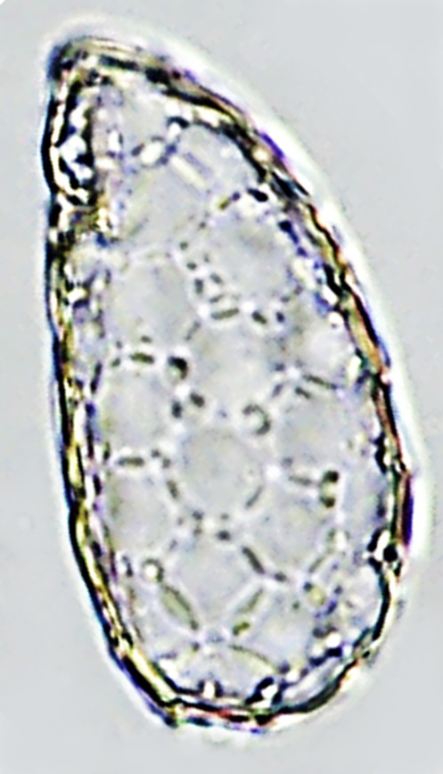 Dimensões e Média (em µm): Comprimento=39-100 (68); Largura=16-49 (30); Altura=17-42 (29)PS=8-21 (13) As medidas (n=21) e as Razões: C/L= 1,9-2,6 (2,3); L/PS=2,0-2,6 (2,3) e C/PS=4,6-5,6 (5,0) foram coincidentes com as do autor.